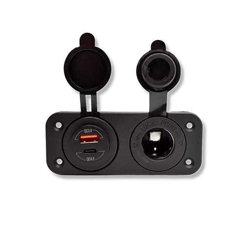 Deutsch-style connectors ensure a quick, watertight installation built for harsh environments. The fused USB/USB-C & 12V Combo with Double Plate protects devices from overload while offering versatile charging for multiple gadgets. Perfect for boats or mobile setups, this combo provides safe, reliable power in a compact, durable, and easy-to-install package.